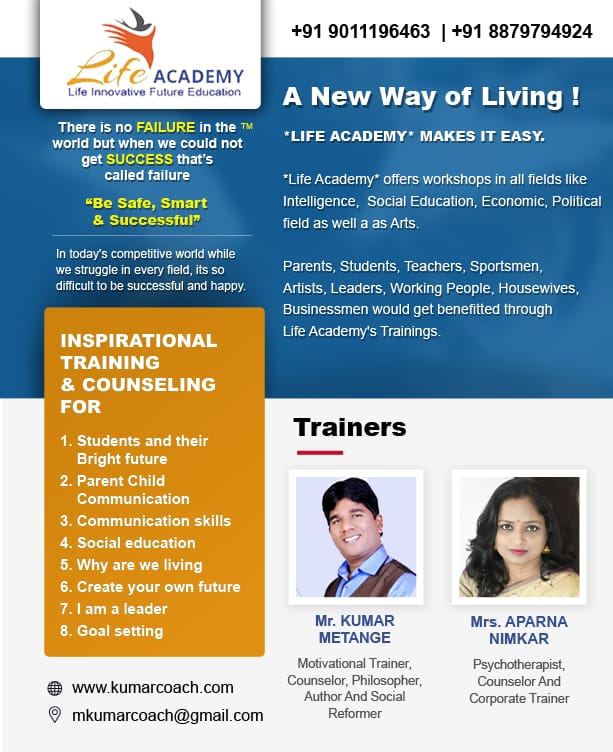 Kumar Metange, the Chairman of Life Academy... is one of the best author, Lyricist Motivational Trainer, Social Activitist... some if his books viz. Safalta ka Sach. Jiyo Jeet ke Liye, Badal Do Jindagi, Bhavkalpak, Jaga Jinknyasathi are very Popular marathi audio album - karuya maharashtra bhagwa sang by famous marathi singer swapnil bandokar is one more feather in his cap... Hon. Balasaheb Thakeray has given best compliments for his audio saying that "Namardala Marad Banawnari Takad Aahe Tumchya Shabdat."